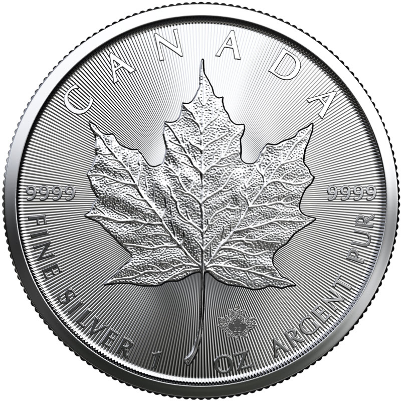 Канадская серебряная инвестиционная монета. С момента первого выпуска этих монет в 1988 году Канадским Королевским монетным двором (Royal Canadian Mint) канадский Кленовый лист стал одной из наиболее популярных серебряных инвестиционных монет. Поставляется в тубах по 25 штук.