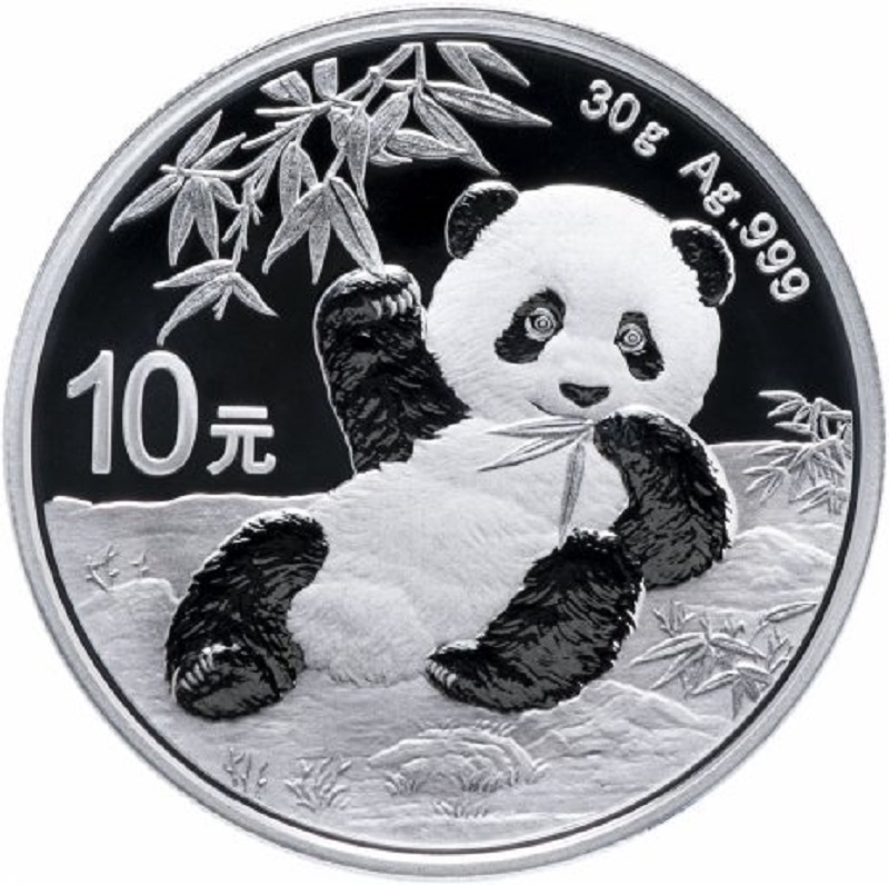 На реверсе монеты изображена панда с веткой бамбука. Слева указан номинал монеты - 10 юаней, вверху — вес монеты (30 г) и проба серебра в монете - 0.999.