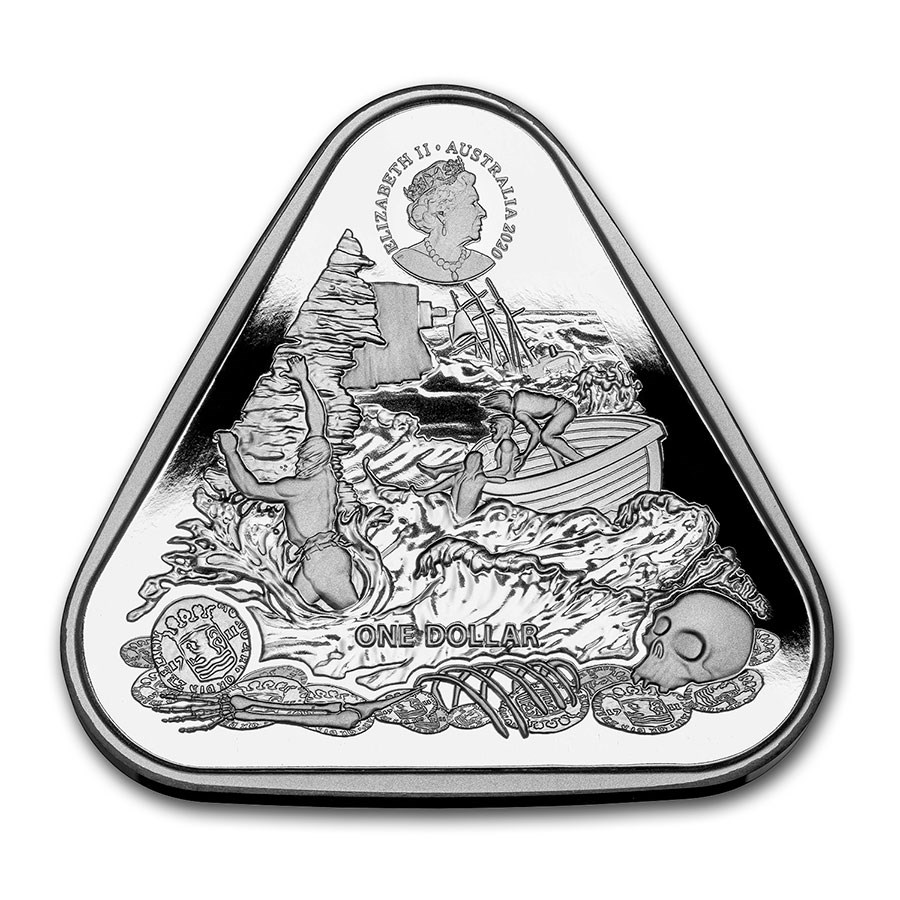 Третья монета из серии «Кораблекрушения Австралии». Серебряная монета, выполненная в форме треугольника, от Королевского монетного двора Австралии.