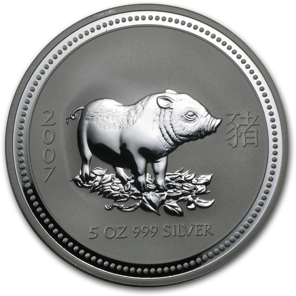 Изображение поросенка. Дизайн также включает в себя китайский иероглиф — «Свинья» справа, слева год выпуска — 2007, внизу указаны вес (5 oz –5 унции), проба (999), название металла (Ag - серебро),