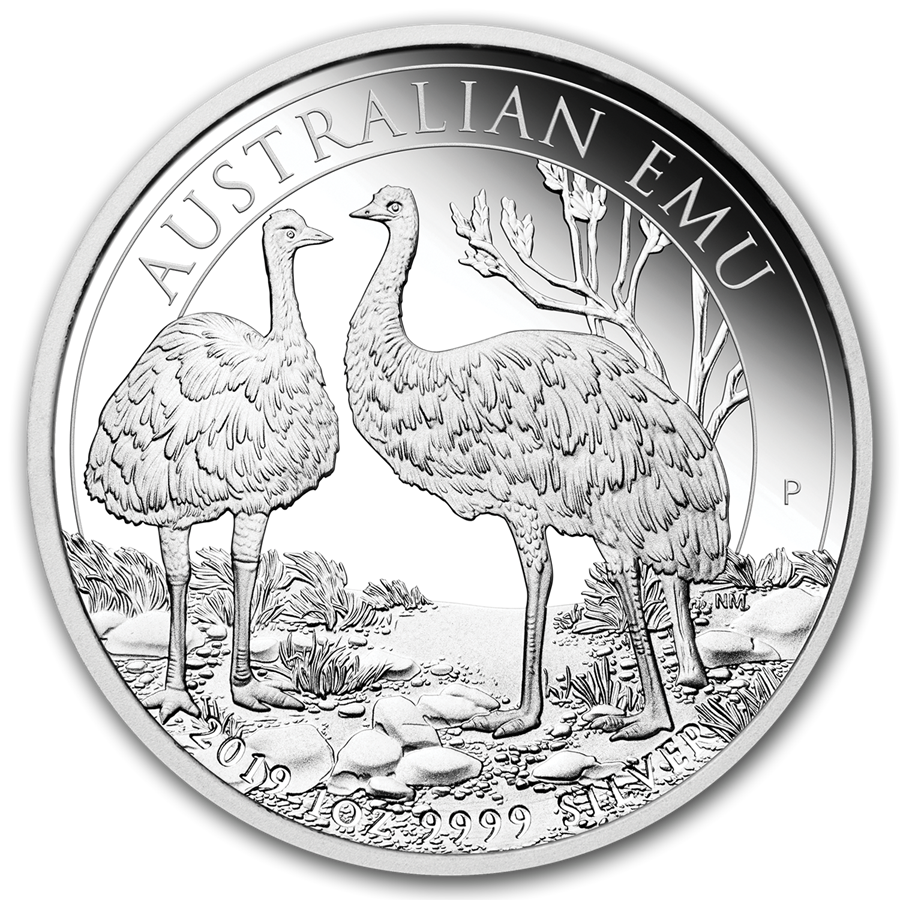 На реверсе изображена пара Страусов Эму на фоне травы и деревьев. Слова "AUSTRALIAN EMU". Внизу монеты помещен год выпуска — 2019, вес монеты "1 OUNCE" - 1 унция и содержание чистого металла - "9999 SILVER" - серебро 9999 пробы. Традиционно на монете есть знак "P", знак Пертского монетного двора Австралии.