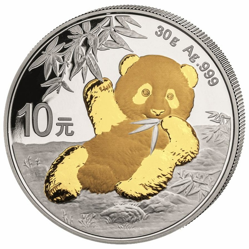 На реверсе монеты изображена позолоченная панда с веткой бамбука. Слева указан номинал монеты - 10 юаней, вверху — вес монеты (30 г) и проба серебра в монете - 0.999.