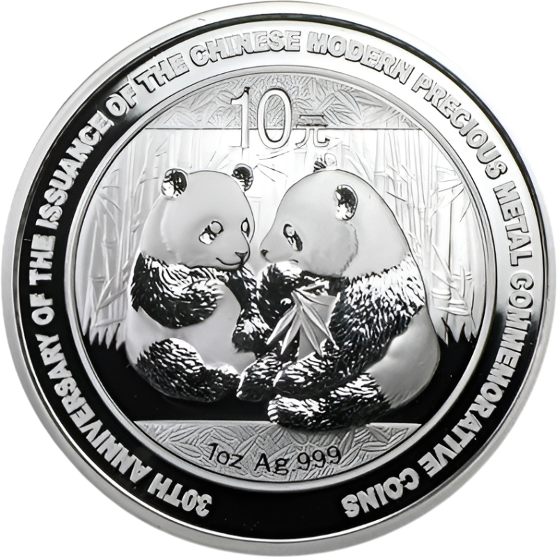 Серебряная инвестиционная монета Китая, выпущенная в честь 30-й годовщины выпуска современных китайских памятных монет из драгоценных металлов.