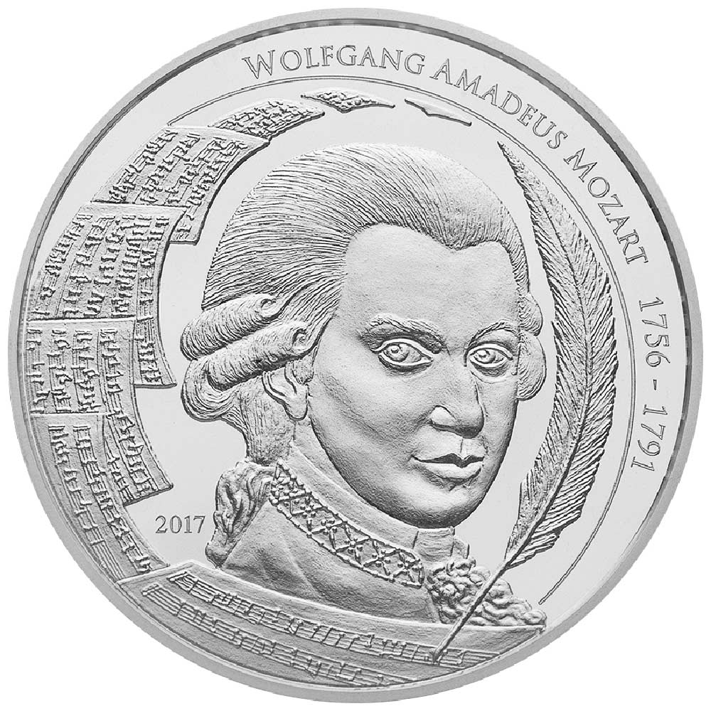 На аверсе монеты изображен портрет Моцарта, окруженного нотами и пером. По ободу вверху полукругом надпись: «WOLFGANG AMADEUS MOZART 1756 – 1791» (Вольфганг Амадей Моцарт. Годы жизни – 1756-1791 гг.). Год выпуска монеты обозначен слева внизу от портрета – «2017».