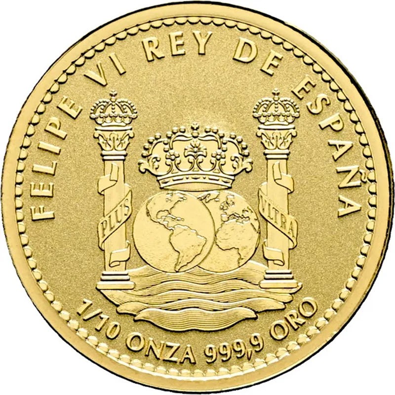 В центре встреча двух полушарий в виде глобусов, увенчанных короной, парящих над морем. С каждой стороны их обрамляют столбы Геркулеса, на которых развеваются две ленты с надписью: PLUS ULTRA (Дальше предела, девиз Испании). Вдоль канта надпись: FELIPE VI REY DE ESPAÑA (Филипп VI, Король Испании), внизу: 1/10 ONZA 999,9 ORO (вес и проба золота).