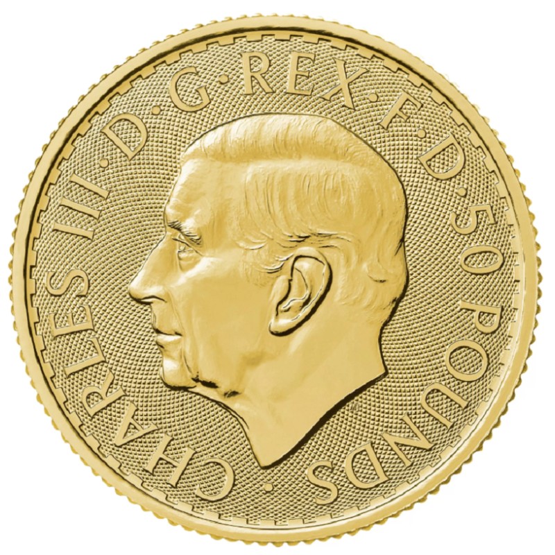 На аверсе золотой инвестиционной монеты Великобритании - Британия - видим портрет короля Чарльза III. По ободу надписи: CHARLES III • D • G • 50 POUNDS •