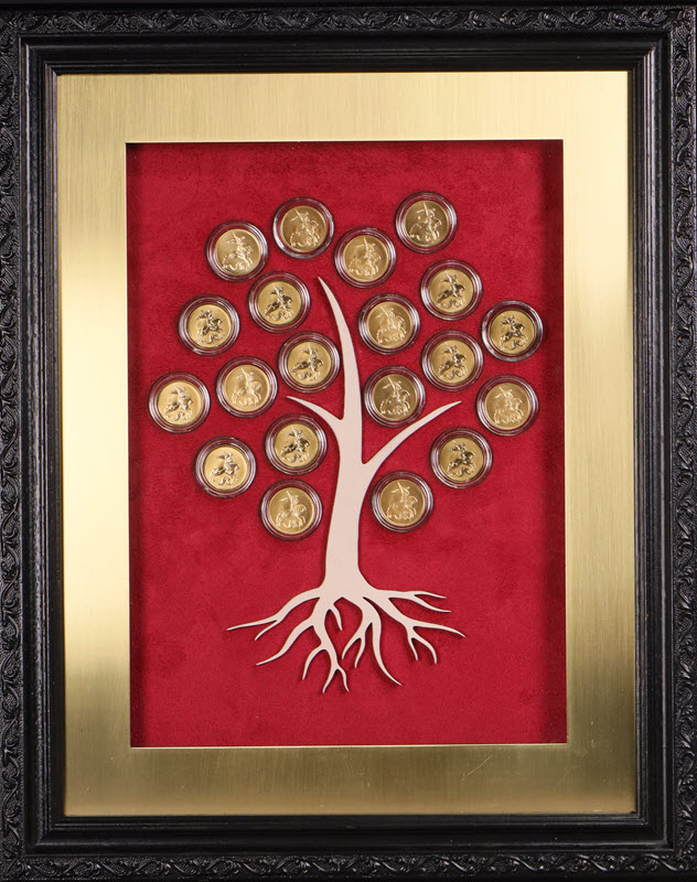 Так возникла задумка, воплотившаяся в чудесный объект, достойный внимания знатоков и почитателей красоты — картинка-шкатулка «Монетный ассамбляж “Древо”». В своей конструкции произведение подобно чудному дереву жизни, ветви которого являются зеркалом судьбы каждого владельца, охраняя самую дорогую ценность — 20 прекраснейших золотых монет «Георгий Победоносец».