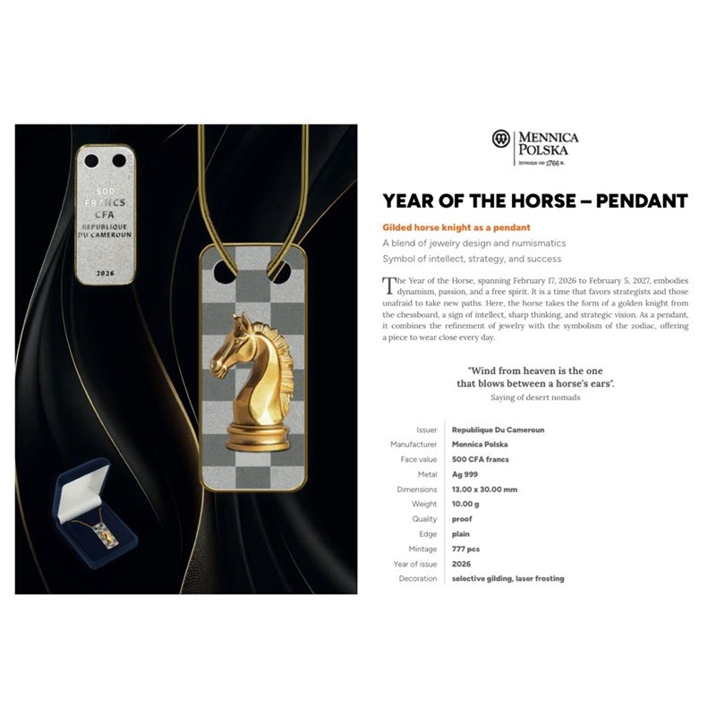 Серебряная монета от польского монетного двора Mint of Poland посвящена символу 2026 года - Лошади. У нее размеры 13 х 30 мм, качество пруф и селективная окраска, может использоваться как кулон. Поставляется в оригинальном футляре с сертификатом подлинности. Тираж: 777 штук.