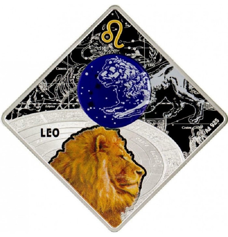 В верхней части монеты расположено изображение из звездного атласа «Firmamentum Sobiescianum», созданного в конце XVII века Иоганном Гевелием, с изображением созвездия Льва на вставке из кобальтового стекла и символом Знак зодиака Лев на верхней части монеты. Внизу есть изображение льва с горшком, представляющее Льва. С правой стороны латинское название знака Зодиака - "LEO".
