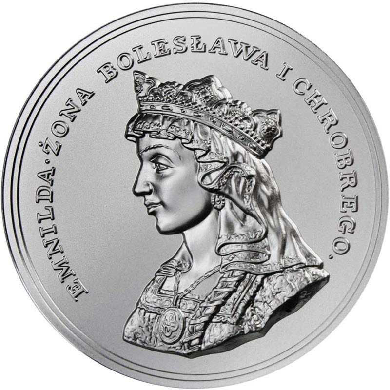 Серебряная монета Ниуэ из серии «Сокровища Станислава Августа» от Польского монетного двора посвящена Эмнильде, жене Болеслава I Храброго.