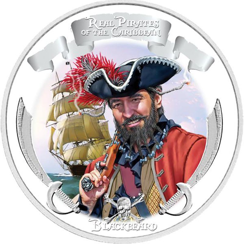 Серебряная монета из серии "Пираты Карибского моря", в которой представлены цветные изображения карибских пиратов Эдварда Тича или Черной Бороды, Калико Джека Рэкхэма, Генри Эйвери и Бартоломью Робертса. Изображения дополняются выдающимися пиратскими символами "Веселого Роджера": двумя саблями и черепом со скрещенными костями.