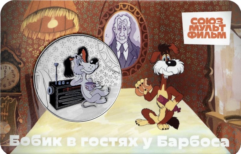 Российский медно-никелевый жетон 2025 года от ММД Гознак из серии «Мультфильмы нашего детства» посвящена мультфильму «Бобик в гостях у Барбоса». У него качество анциркулейтед и селективная окраска. Поставляется в блистере. Тираж: 7000 штук.