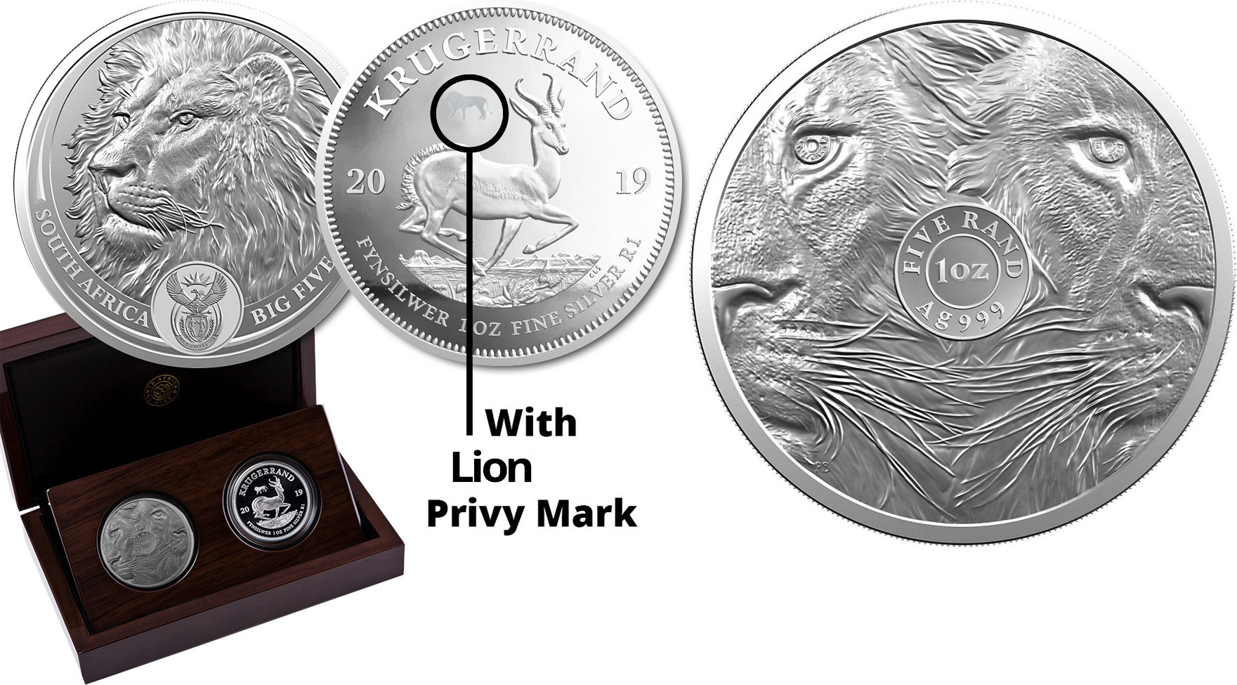 Красивый набор из двух серебряных монет, объединяющий всем известную инвестиционную монету ЮАР — «Крюгерранд» и монету из серии «Большая Африканская пятерка» — Лев. Монеты упакованы в деревянный футляр. Ограниченный тираж.