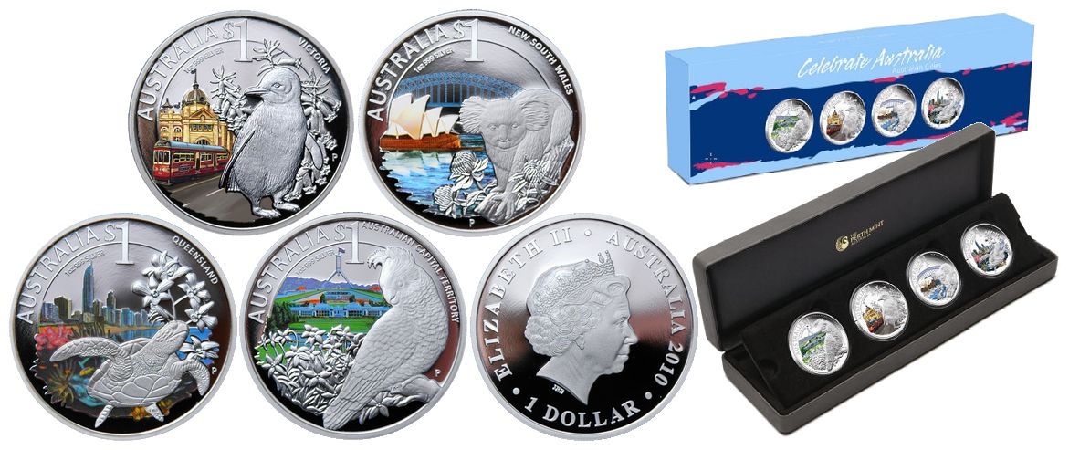 Набор из 4-х серебряный монет Австралии "Гордость Австралии" 2010 г.в., 4*31,1 г чистого серебра (Проба 0,999)