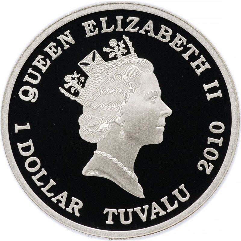 Портрет Елизаветы II, название страны-эмитента — TUVALU, год выпуска — 2010, номинал монеты — 1 DOLLAR