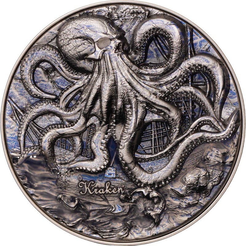 Эта удивительная монета весом в 2 унции серебра и 11.5 унций меди посвящена кракену. У нее качество античной отделки, сверхвысокий рельеф и эмалевое покрытие, светящееся в темноте. Поставляется в оригинальном футляре с сертификатом подлинности. Тираж: 199 штук.