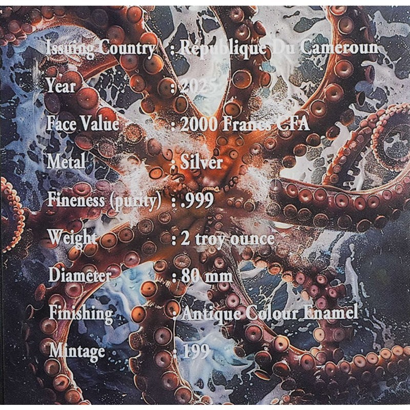 На аверсе изображена голова кракена с медно-красными глазами. Внизу изображен герб Камеруна. Вокруг герба надпись: REPUBLIQUE DU CAMEROUN 2 oz Ag 999 · 2000 FRANCS CFA · 2025 (страна-эмитент, вес и проба серебра, номинал, год чеканки). На гурте надпись: Ag 999 2 oz S3 (вес и проба серебра).