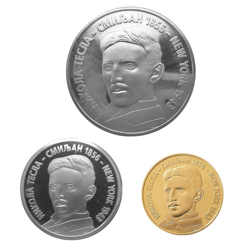 На реверсе всех монет изображен портрет Никола Теслы. Вдоль канта надпись: НИКОЛА ТЕСЛА - СМИЉАН 1856 - NEW YORK 1943 (Никола Тесла, годы жизни).