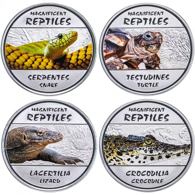 Этот чудесный набор из четырех серебряных монет весом в 20 грамм каждая посвящен самым известным рептилиям в мире. У них качество пруф и селективная окраска. Поставляются в оригинальном футляре с сертификатом подлинности. Тираж: 3000 штук.