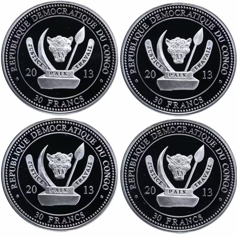 На аверсе всех монет изображен герб Демократической Республики Конго. Вдоль канта надпись: REPUBLIQUE DU CONGO 2013 • 30 FRANCS • (страна-эмитент, год чеканки, номинал).