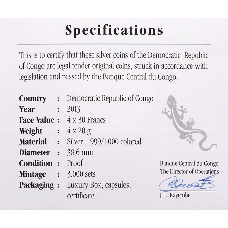 Набор из 4-х серебряных монет Конго "Великолепные рептилии" 2013 г.в., 4*20 г чистого серебра (проба 999)