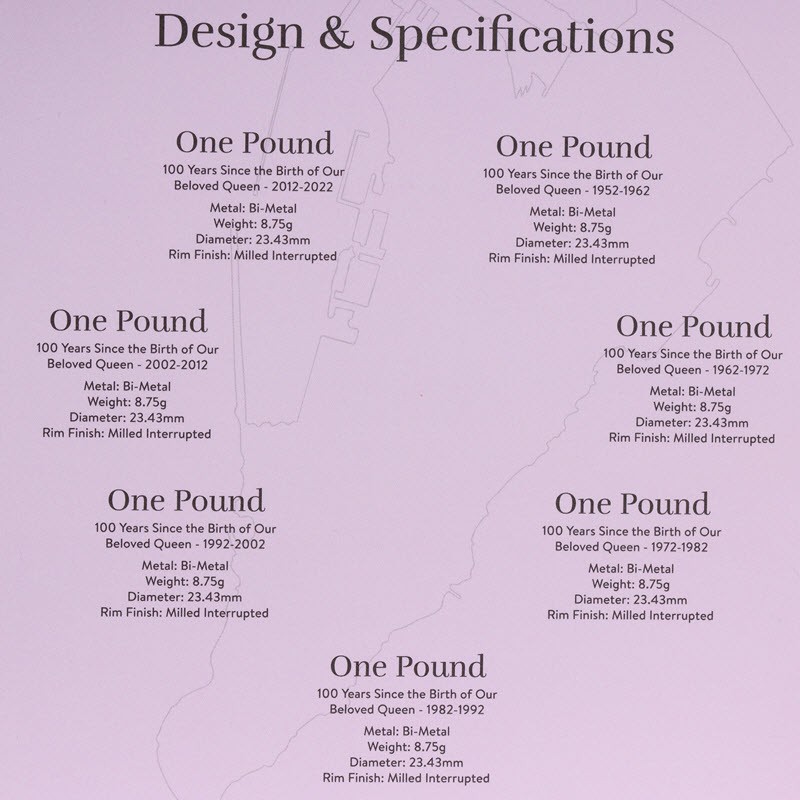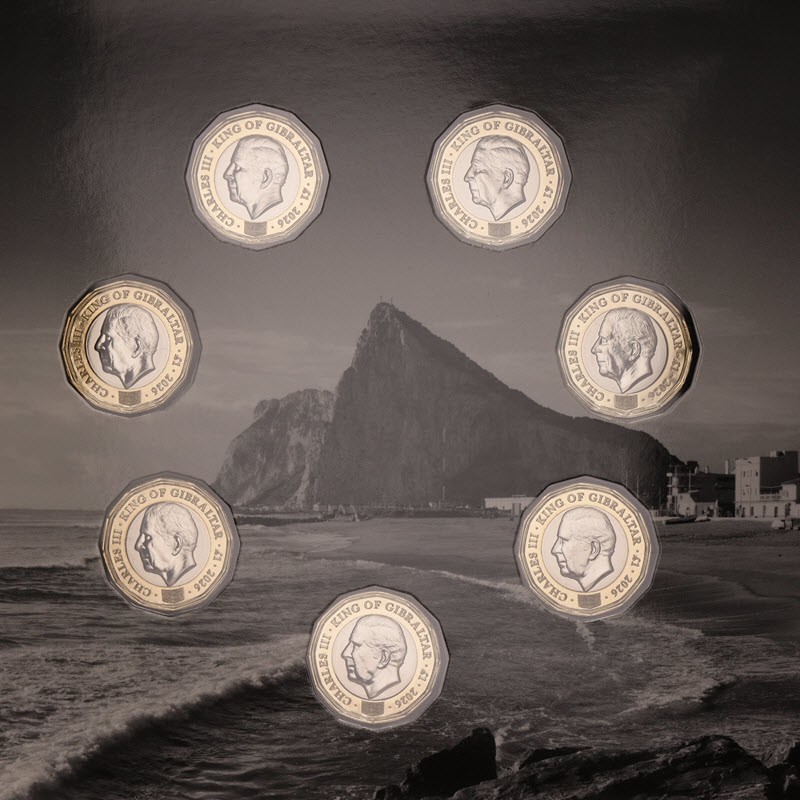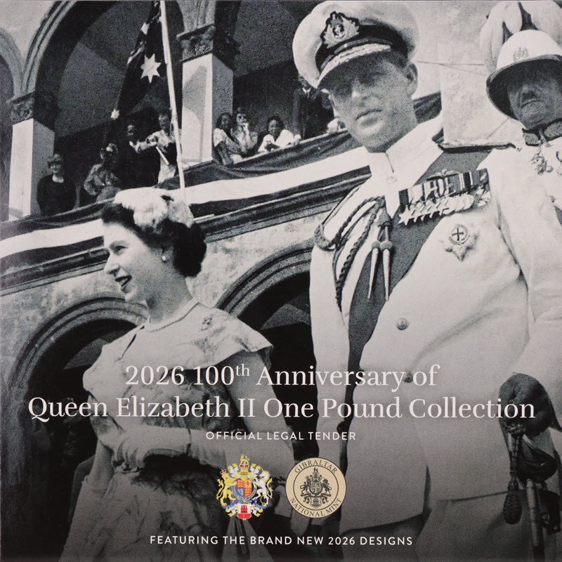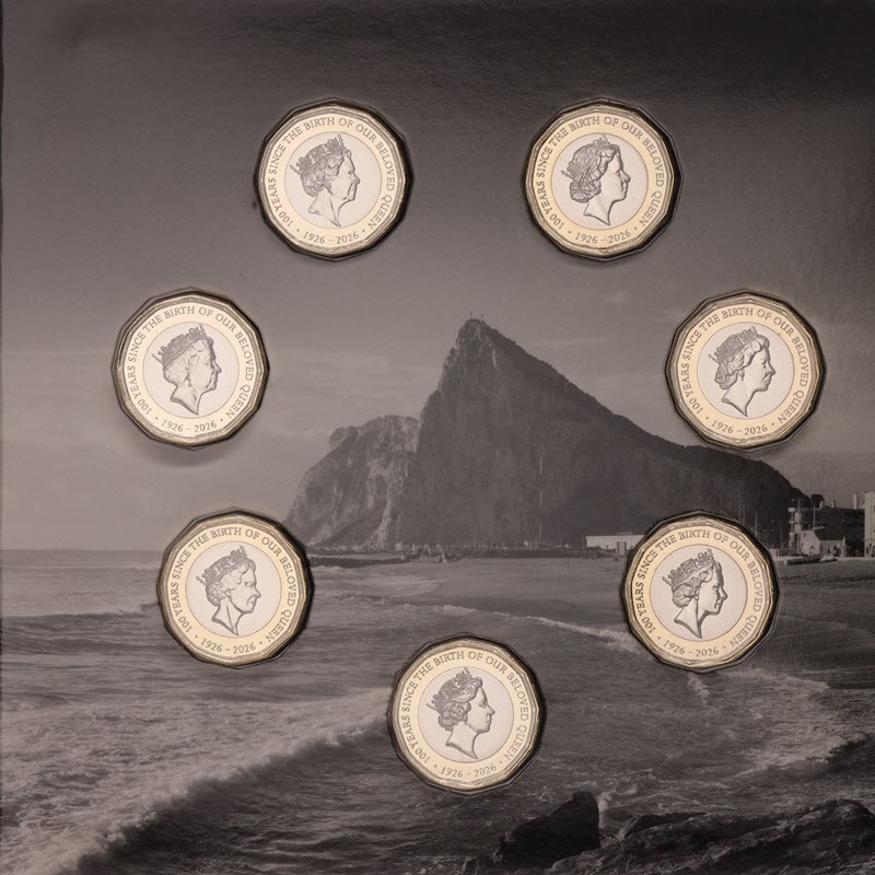 Набор монет Гибралтара в честь 100-летия королевы Елизаветы II от монетного двора Tower Mint. Каждое изображение представляет собой отдельное десятилетие рекордного правления королевы Елизаветы II, а дизайн реверса является центральным элементом коллекции, объединяя историю и нумизматическое наследие. Коллекция монет номиналом 1 фунт стерлингов — первая в своем роде, в которой представлены все десятилетия жизни королевы на одном и том же носителе, что делает ее первой в мире коллекцией биметаллических монет такого типа.