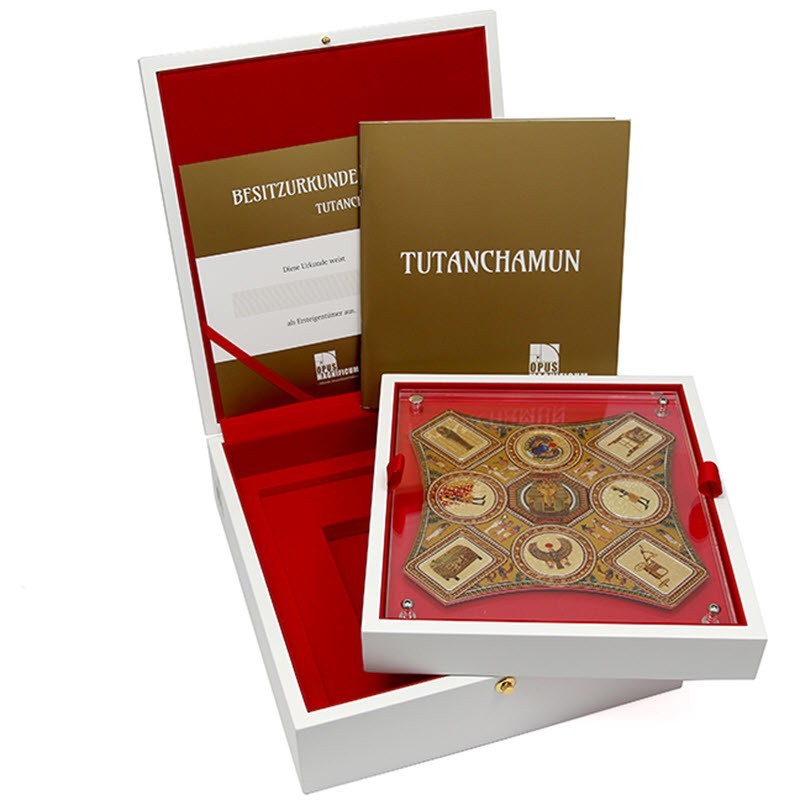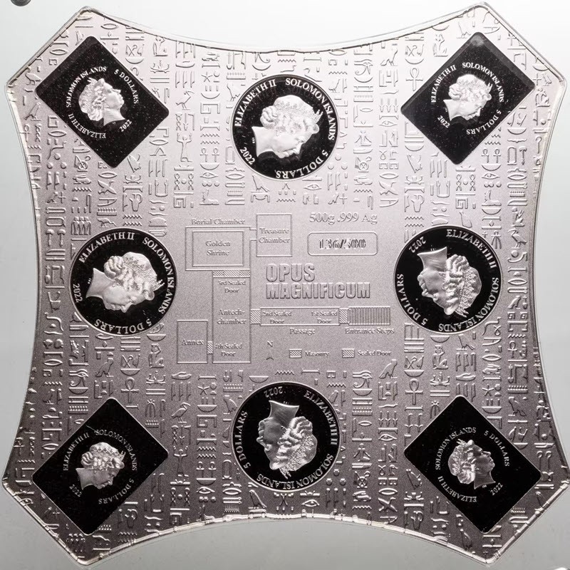 На реверсе каждой серебряной монеты изображен артефакт, найденный в гробнице самого молодого фараона египетской империи — он умер всего в 18 лет! Открытие было сделано археологом Говардом Картером 29 ноября 1922 года в Долине царей, недалеко от города Луксор на юге Египта. Каждая монета имеет специальные функции: дополнительная чеканка, чеканка микрокласса, нанесение аутентичного цвета, нанесение полупрозрачного цвета, нанесение микрозолота 999 пробы и нанесение матового золота.