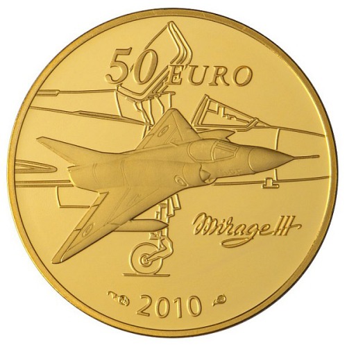 На реверсе памятной золотой монеты - изображение истребителя "Мираж III". Сверху - номинал монеты (50 евро), снизу - год выпуска монеты (2010).