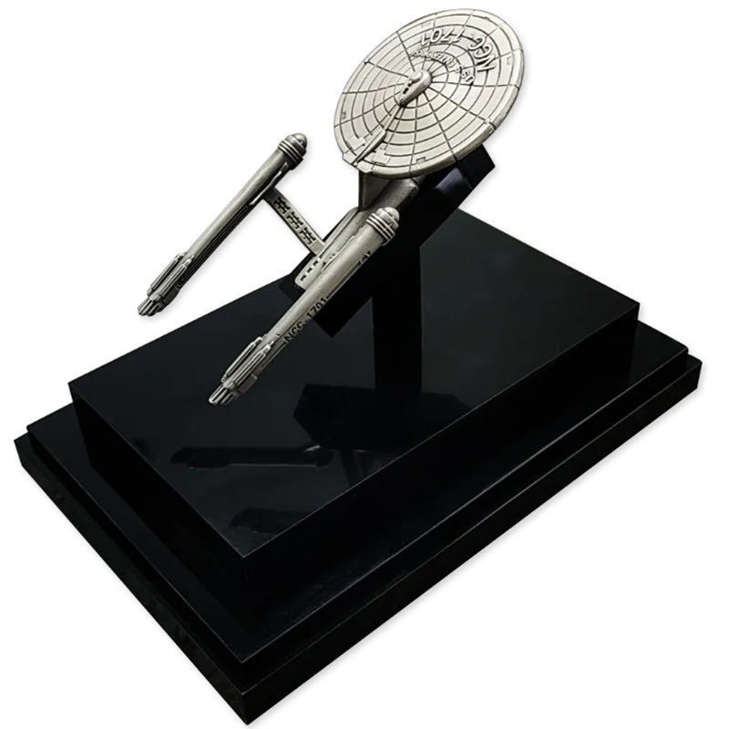 Эта чудесная серебряная монета весом в 3 унции посвящена легендарному звездолету USS Enterprise NCC-1701 из сериала «Звездный путь». У нее 3D-форма размером 103 x 45.6 x 23.5 мм и качество античной отделки. Поставляется в футляре с сертификатом подлинности. Тираж: 999 штук.