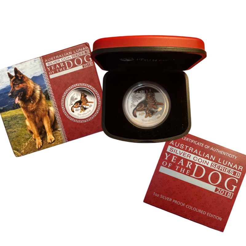 Серебряная монета Австралии «Год Собаки» 2018 г.в. (пруф с цветом), 31.1 г чистого серебра (проба 9999)