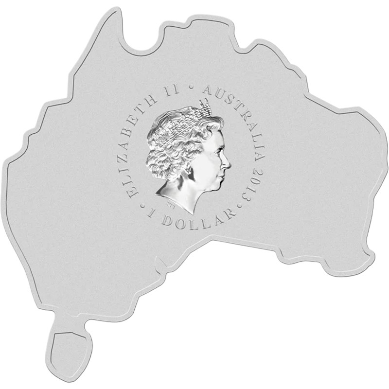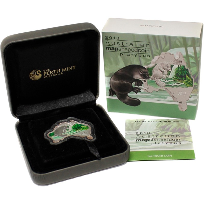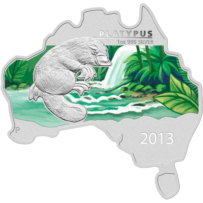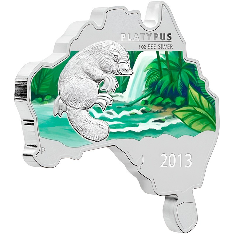 Эта уникальная серебряная 1 унцовая монета Пертского монетного двора в форме карты Австралийского континента. Она является частью серии «Животные на карте Австралии» (Australian Map Shaped Coin Series) и посвящена утконосу.