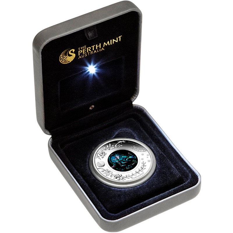 Эта чудесная 1 унцовая серебряная монета Пертского монетного двора из серии «Австралийские опалы». У нее качество пруф и вставка из австралийского опала. Поставляется в оригинальном футляре с подсветкой, которая загорается при открытии футляра, подчёркивая опаловый дизайн и символизируя лунный свет. В комплект входит сертификат подлинности. Тираж: 8000 штук.