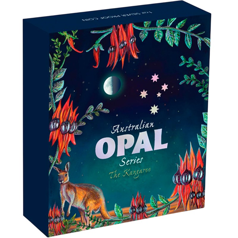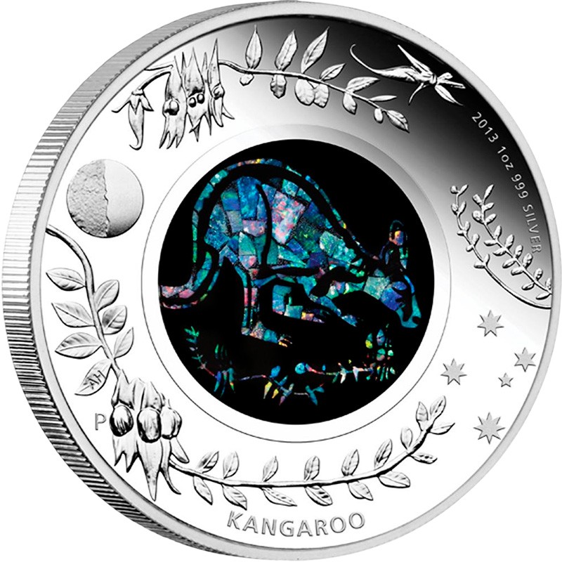 В центре монеты расположен кенгуру, выполненный из цельного опала. На внешнем кольце изображены листья и цветы пустынного гороха Стерта, луна и созвездие Южный Крест. Вдоль канта надпись: 2013 1 oz 999 SILVER P KANGAROO (год чеканки, монограмма Пертского монетного двора, вес и проба серебра, кенгуру).