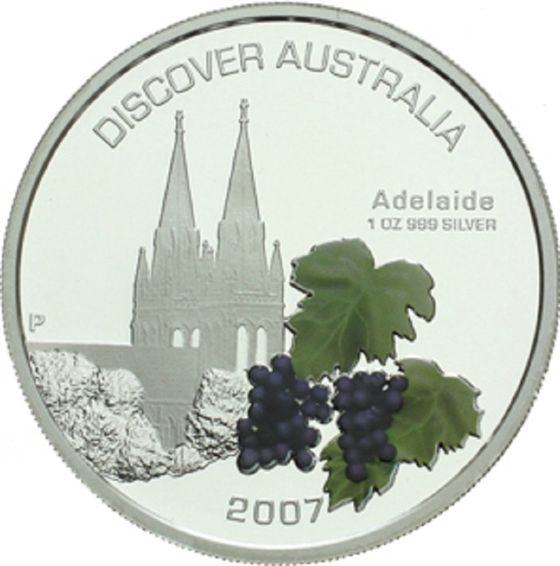 Цветное изображение грозди винограда на фоне собора Аделаиды. Сверху надпись «Discover Australia» (название серии) и год — 2007. Снизу название Adelaide 1 OZ 999 SILVER — Аделаида, вес и чистота металла.