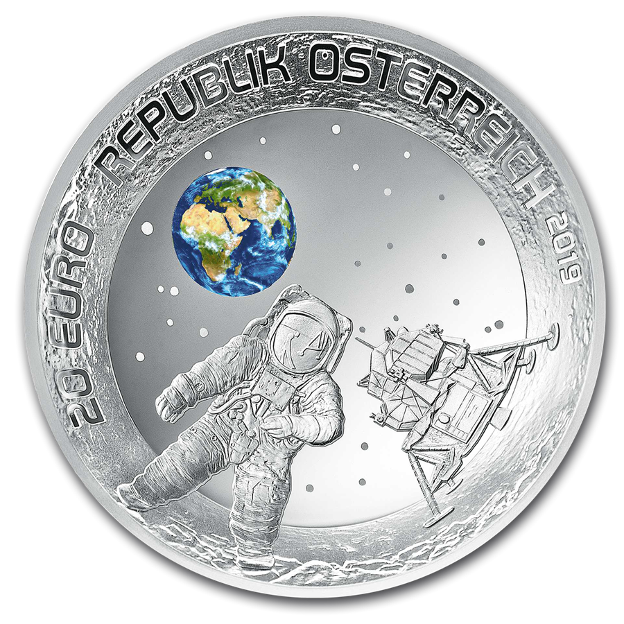 Серебряная монета от Австрийского монетного двора, посвященная полету Аполлон-11 на Луну. Монета имеет вогнуто-выпуклую форму и цветные вставки.