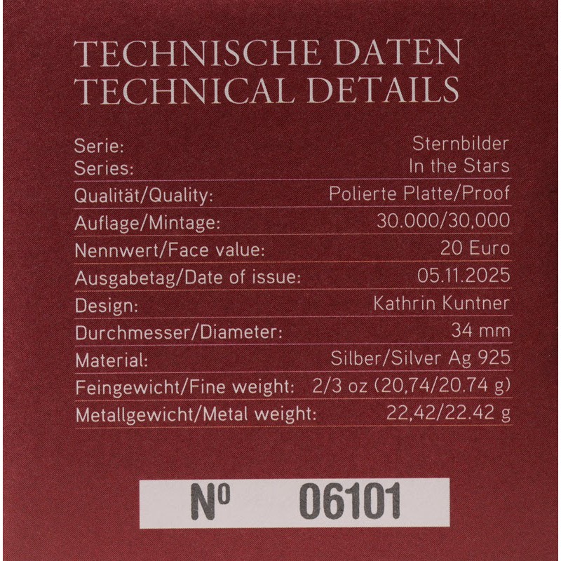 На аверсе изображено зодиакальное кольцо с названиями всех 12 знаков и их символами. В центре Символ Козерога. Слева розовый кварц, символизирующий созвездие Козерога. Вдоль канта надпись: REPUBLIK · ÖSTERREICH 20 EURO (страна-эмитент, номинал).
