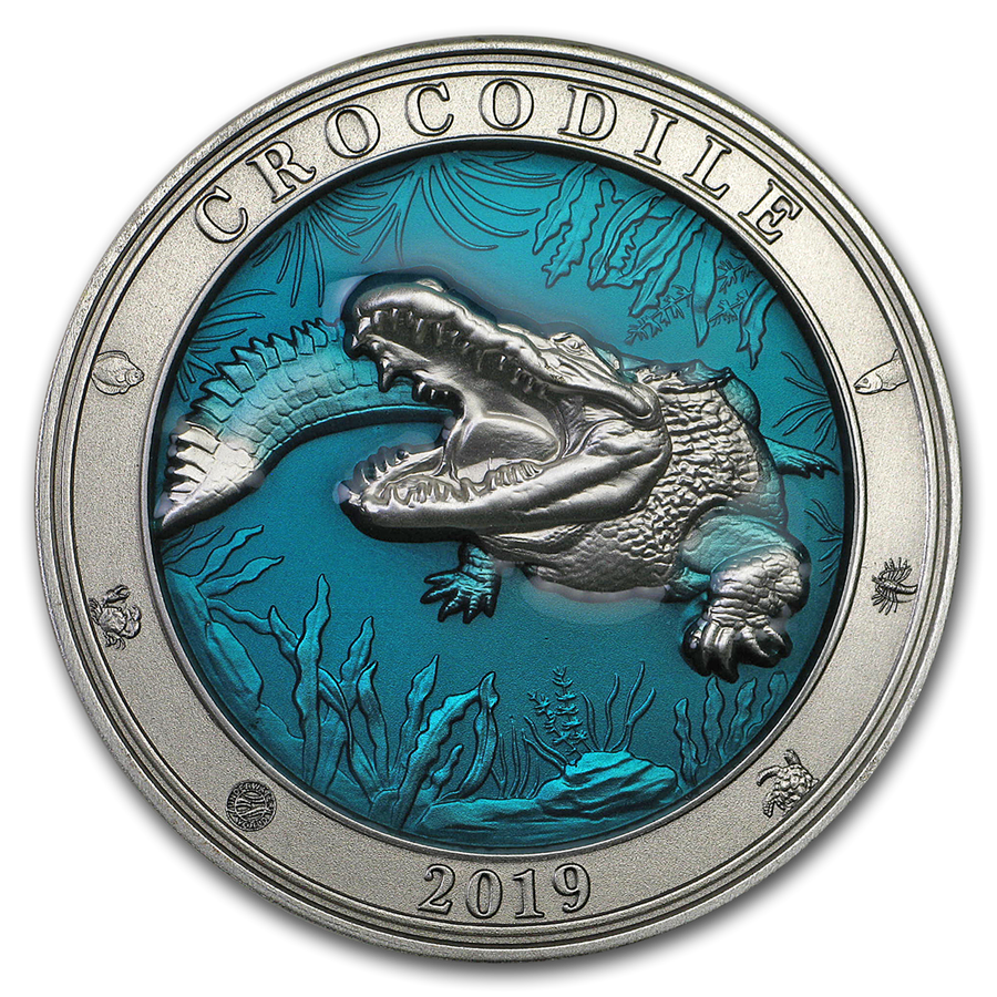 Изображение крокодила, появляющегося из синей эмали. Сверху название монеты, внизу — год выпуска.