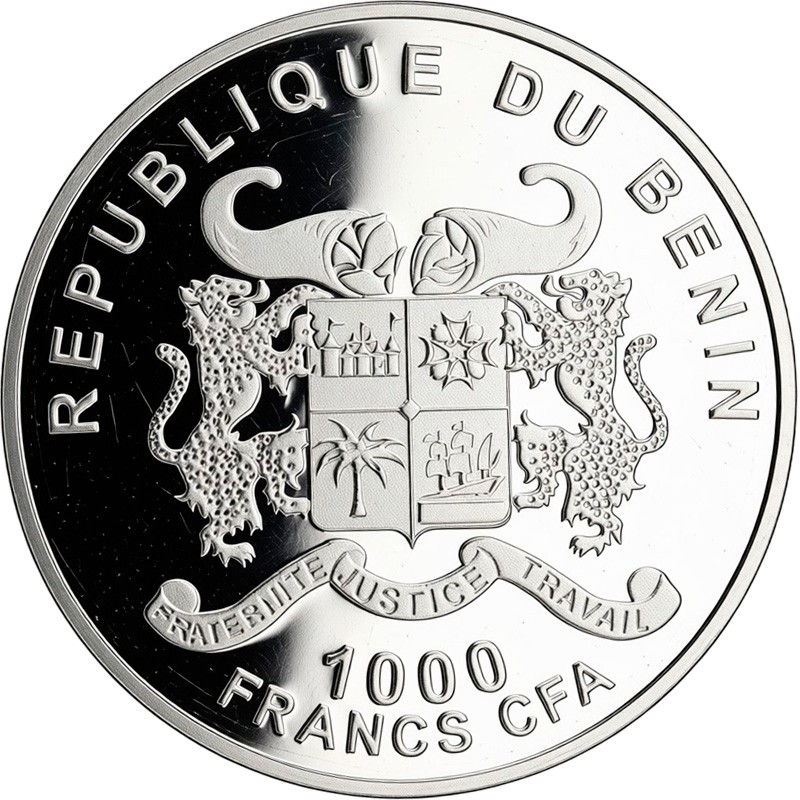 На аверсе изображен герб Республики Бенин — геральдический щит, который поддерживают два леопарда. Над щитом — два рога изобилия, наполненные зерном и песком, символизирующие процветание. Под щитом - на ленте надпись на французском языке: FRATERNITE JUSTICE TRAVAIL (Братство, Правосудие, Труд). Вверху вдоль канта полукругом надпись: REPUBLIQUE DU BENIN (Республика Бенин). Внизу номинал - 1000 FRANCS CFA.