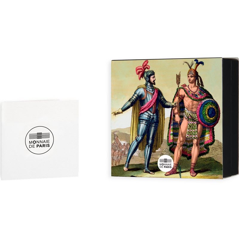 На реверсе изображены испанский конкистадор и Атауальпа, последний император инков. В центре монеты над мифическим озером возвышается золотой идол инков «ЭЛЬДОРАДО». Внизу надпись: ELDORADO R 2025 F (Эльдорадо, Франция, год чеканки).