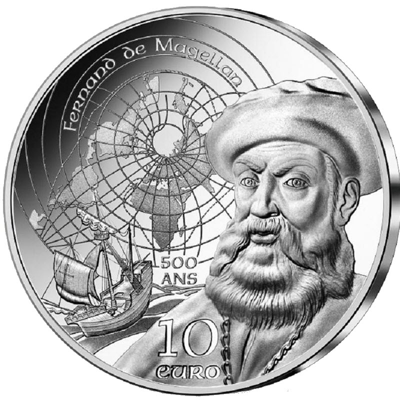 С 2007 года Монетный двор Парижа выпускает монеты в честь мест и достопримечательностей, внесенных в список Всемирного наследия ЮНЕСКО. Выпуск 2021 года посвящен 500-летию со дня смерти исследователя Фернандо де Магеллана. Монета номиналом 10 евро поставляется в оригинальной коробке с сертификатом подлинности.