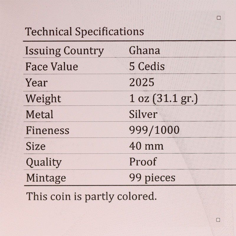 На аверсе монеты изображен государственный герб Ганы с надписями: «REPUBLIC OF GHANA» - страна-эмитент, «FIVE CEDIS» - номинал, «1 OZ.999 FINE SILVER» - вес и проба серебра и «2025» - год выпуска.