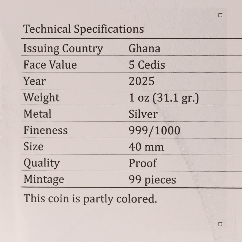 На аверсе монеты изображен государственный герб Ганы с надписями: «REPUBLIC OF GHANA» - страна-эмитент, «FIVE CEDIS» - номинал, «1 OZ.999 FINE SILVER» - вес и проба серебра и «2025» — год выпуска.