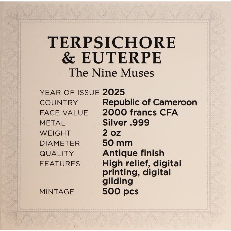 Серебряная монета Камеруна "Девять муз. Терпсихора и Эвтерпа" 2025 г.в., 62.2 г серебра (проба 999)