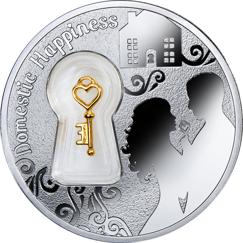 Слева капсула в форме замочной скважины с серебряным филигранным ключом, покрытым 24-каратным золотом. С правой стороны – изображение влюбленной пары с ключом в руках и особняком. На заднем плане - орнамент. Слева по краю – название монеты на английском языке: Domestic Happiness.