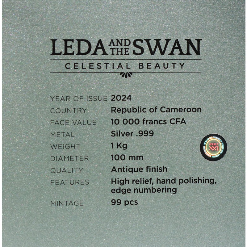История Леды и Лебедя изображает слияние смертного и божественного. Он веками вызывает интерес в сердцах людей и показывает, что даже всемогущий Зевс может поддаться манящим чарам небесной красоты. Кудри Леды, ниспадающие на плечи, изогнутая поза и птица, ласкающая ее бедра, составляют момент страсти, запечатленный в серебре. Слева вверху надпись: LEDA AND THE SWAN.