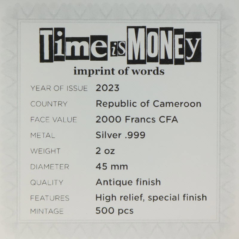 Вы всегда можете заработать больше денег, но нет возможности вернуть потерянное время. Слова Бенджамина Франклина стали принципом и символом современной жизни. Чтобы полностью отразить подлинность этой метафоры, Монетный двор разработал монету весом 2 унции с различными шрифтами с высоким рельефом и специальной отделкой, которая создает впечатление букв пишущей машинки.
