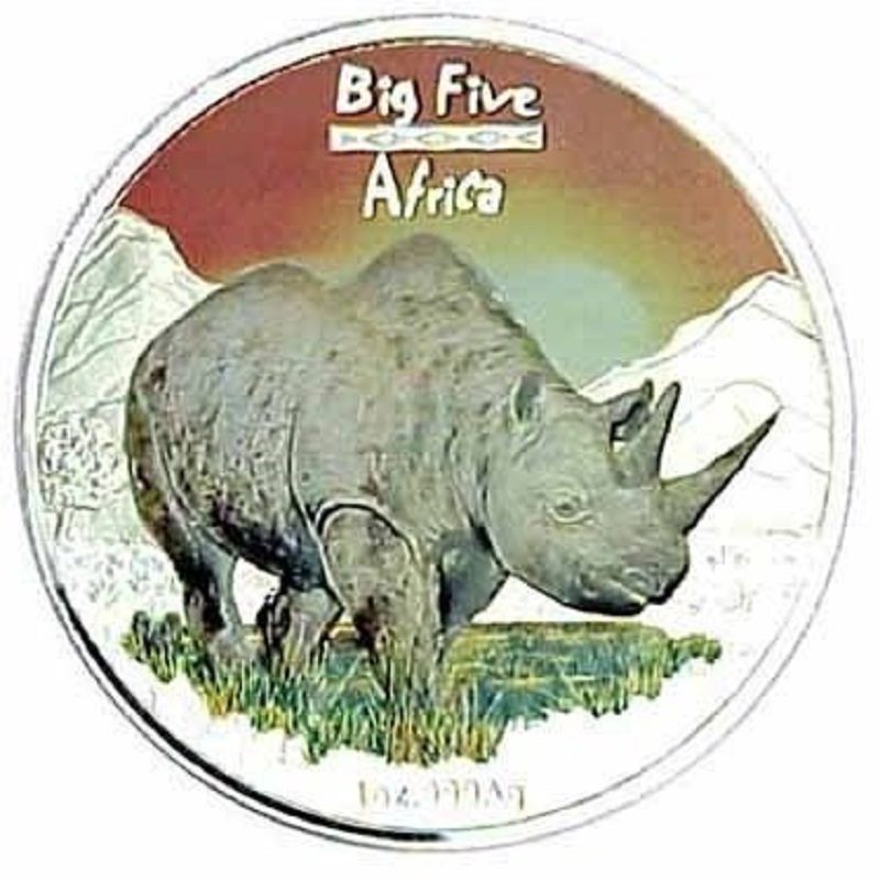 Коллекционная серебряная монета из серии «Большая пятерка Африки», выполненная с элементами цвета. Тираж всего 1000 штук.