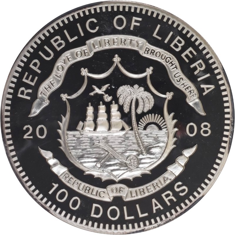 В центре государственный герб Республики. Внизу по ободу кругом указан номинал: 100 DOLLARS, вверху - страна-эмитент: REPUBLIC OF LIBERIA, а год чеканки 2008, поделен наполовину гербом. Над гербом на ленте надпись: THE LOVE OF LIBERTY BROUGHT US HERE (Любовь к свободе привела нас сюда), а под ним: REPUBLIC OF LIBERIA (Республика Либерия).