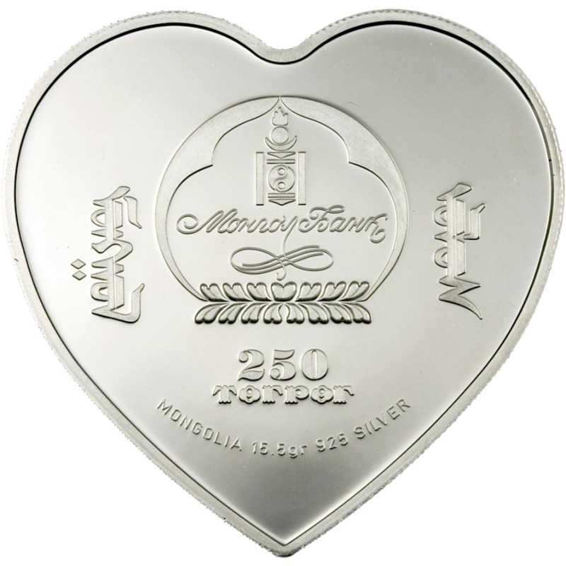 Эмблема банка, номинал - 250 TӨГPӨГ и название страны - MONGOLIA; вес и чистота металла- 15.5gr 925 SILVER