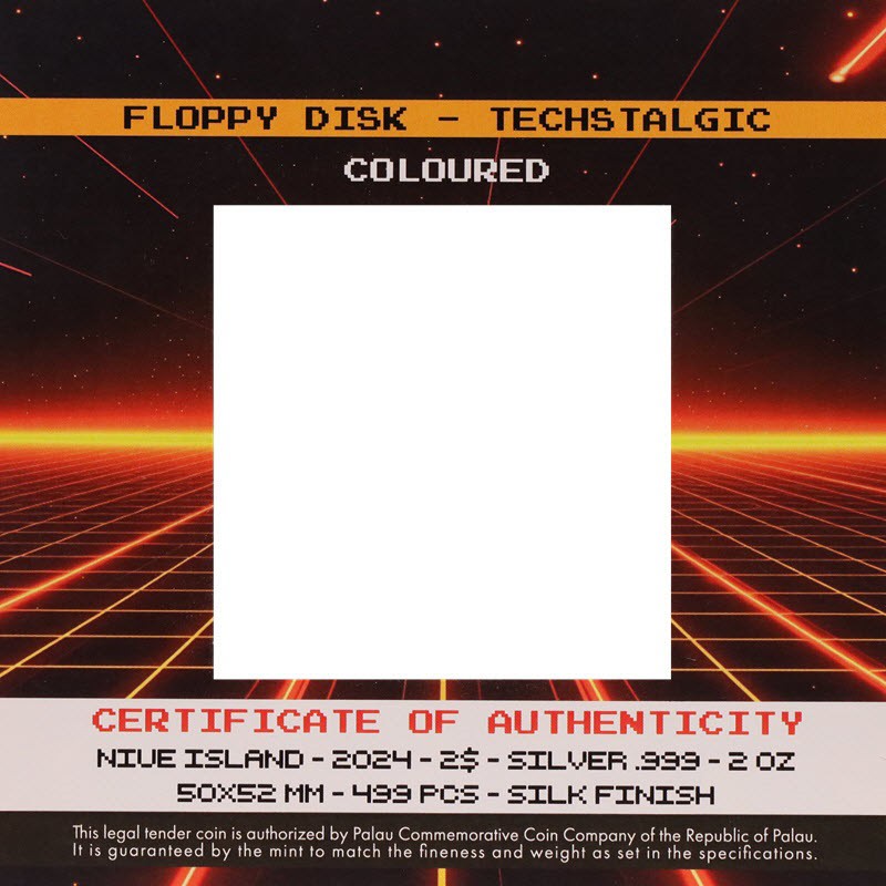 На реверсе монеты изображена 3,5-дюймовая дискета - известный носитель информации, который широко использовался в 1980-х и 1990-х годах для хранения и передачи компьютерных данных! Вся монета имеет окраску, которая идеально воссоздает внешний вид устройства, каким оно было, с его черным пластиком и бело-оранжевой этикеткой! Этот шедевр сочетает в себе нумизматический артистизм и ностальгическую любовь к информационным технологиям и тем большим изменениям, которые они привнесли в нашу повседневную жизнь! На реверсе также имеются надписи: "FLOPPY DISK" - название монеты, "2 OZ SILVER .999" - вес и чистота драгоценного металла, "MINTAGE 499" - тираж.